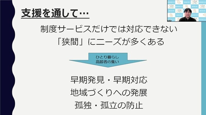 それは、地域でつながり支え合うという視点によって、制度やサービスの枠組みだけでは対応しきれない課題に目を向け、人と人との小さな支え合いを積み重ねているという点です。